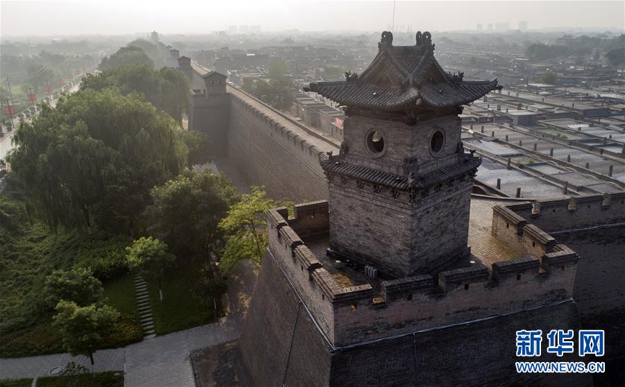 这是7月20日无人机拍摄的平遥古城墙与护城河。平遥古城城墙总周长6163米,墙高约12米,把面积约2.25平方公里的平遥县城隔为两个风格迥异的世界。城墙以内街道、铺面、市楼保留明清形制,城墙以外为新城。