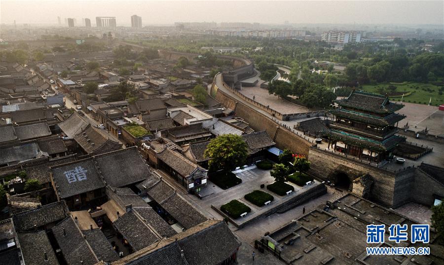 这是7月20日无人机从南门拍摄的平遥古城全景。鸟瞰平遥古城,形同一只欲行未动的乌龟,“龟”头南尾北,上下东西四门比拟为龟之四足,故有“龟城”之说。