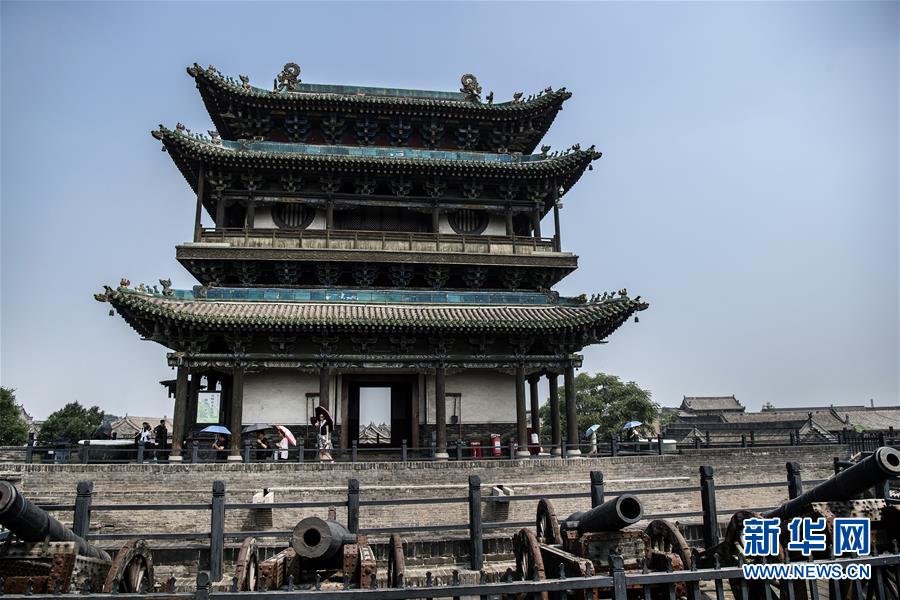 7月20日,游人在平遥南门城楼上游览。