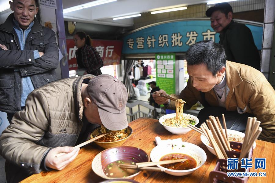 冉光辉(前右)在重庆朝天门大正商场附近吃小面,这是他的午餐(1月5日摄)。新华社记者王全超摄