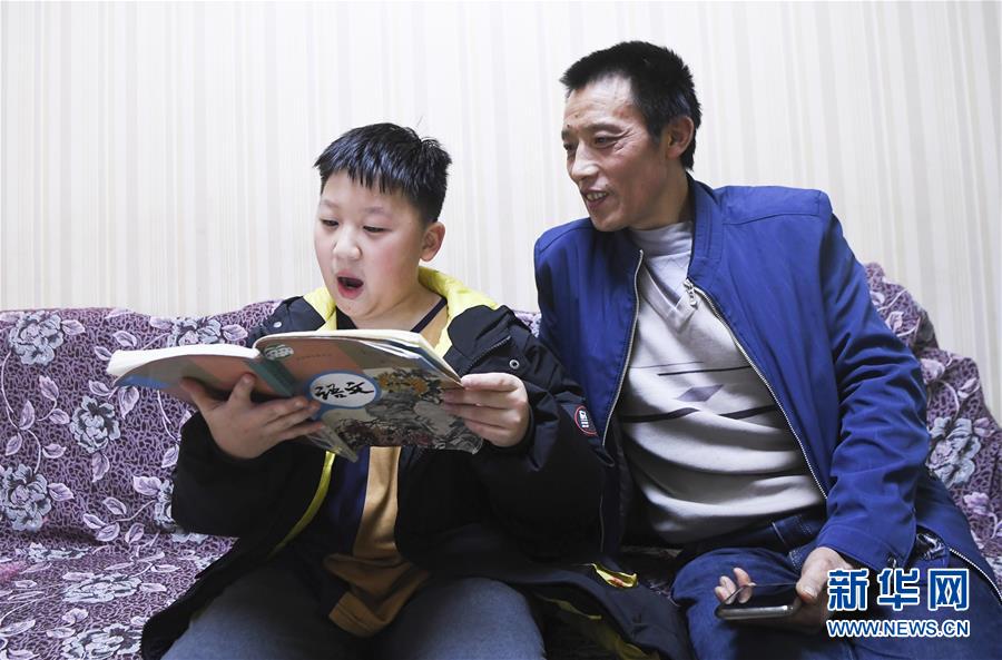 晚饭后,12岁的儿子冉俊超在家里朗诵课文,冉光辉在一旁听(1月5日摄)。新华社记者王全超摄