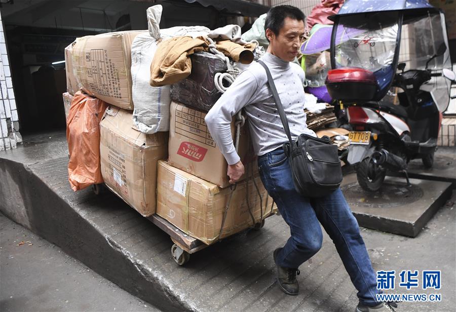 冉光辉用小板车载着货物,从重庆朝天门大生商场出发,前往发货地点(1月5日摄)。新华社记者王全超摄