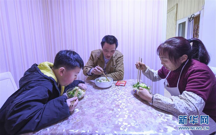 冉光辉和妻子瞿光芳、儿子冉俊超在家里吃晚饭(1月5日摄)。新华社记者王全超摄