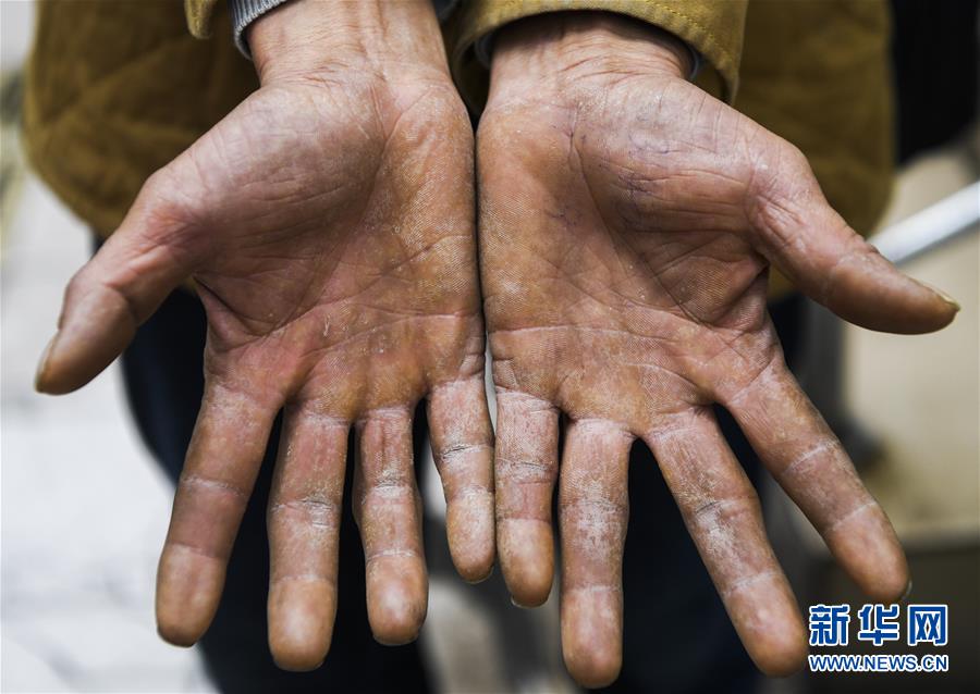 冉光辉展示自己的双手(1月5日摄)。由于长期搬运重物,他的手磨出了不少老茧,指关节也有点变形。新华社记者王全超摄