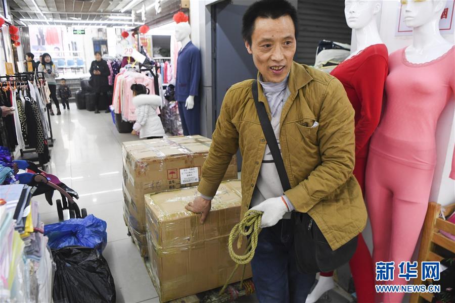 冉光辉在重庆朝天门大正商场内搬运货物(1月5日摄)。新华社记者王全超摄