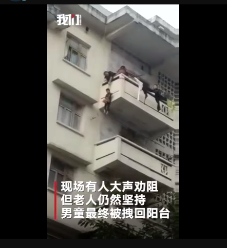 险!老太用绳子绑孙子从5楼吊至3楼救猫 网友:孙子是买猫送的?