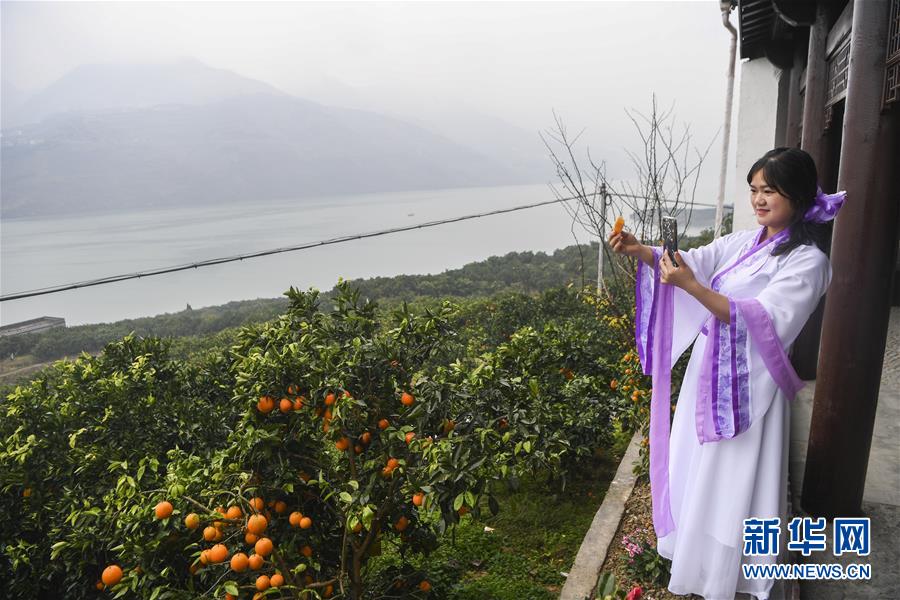 工作人员在重庆市奉节县安坪镇三坨村通过电商直播平台推介脐橙产品(2019年12月28日摄)。新华社记者王全超摄
