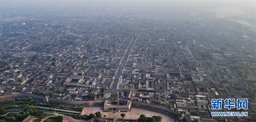 这是7月20日无人机从南门拍摄的平遥古城全景。鸟瞰平遥古城,形同一只欲行未动的乌龟,“龟”头南尾北,上下东西四门比拟为龟之四足,故有“龟城”之说。