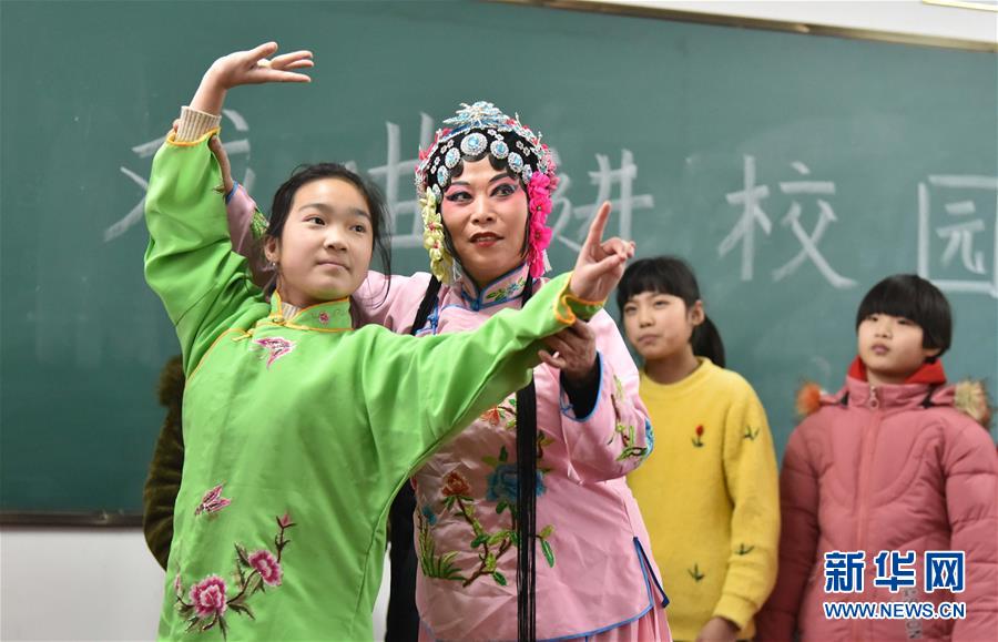 1月7日,定州市兴定秧歌剧团演员在明月店镇吴咬村小学指导学生练习戏曲表演基本功。 新华社记者 朱旭东 摄