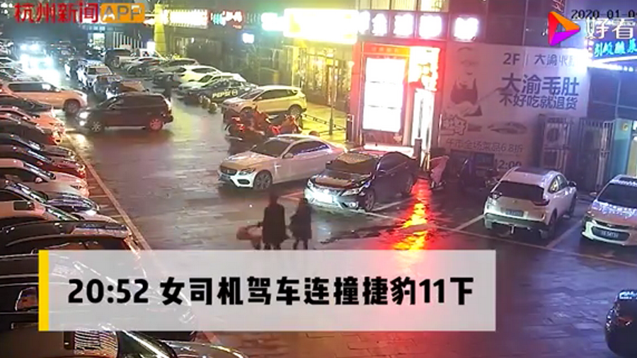 通过监控发现,捷豹车当时并没有停在停车位上,而是横着停在停车位前的通道上,正好挡住了停在停车位里面的车辆。晚上8点40左右,一辆白色丰田普拉多越野车被捷豹挡住无法出去,10多分钟后,司机通过倒车再加速十几次撞击捷豹,最终把车辆撞开后驶离现场。