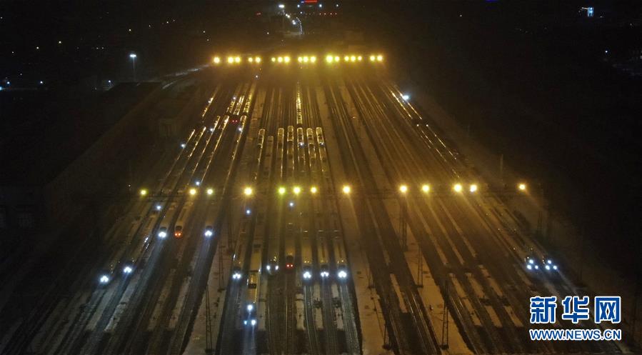 1月8日,在沈阳动车段沈阳北动车运用所存车线,检修整备好的动车组列车整装待发(无人机照片)。2020年春运临近,中国铁路沈阳局集团有限公司沈阳动车段沈阳北动车运用所加强对动车组列车的检修整备工作,为即将到来的春运做好准备。新华社记者杨青摄