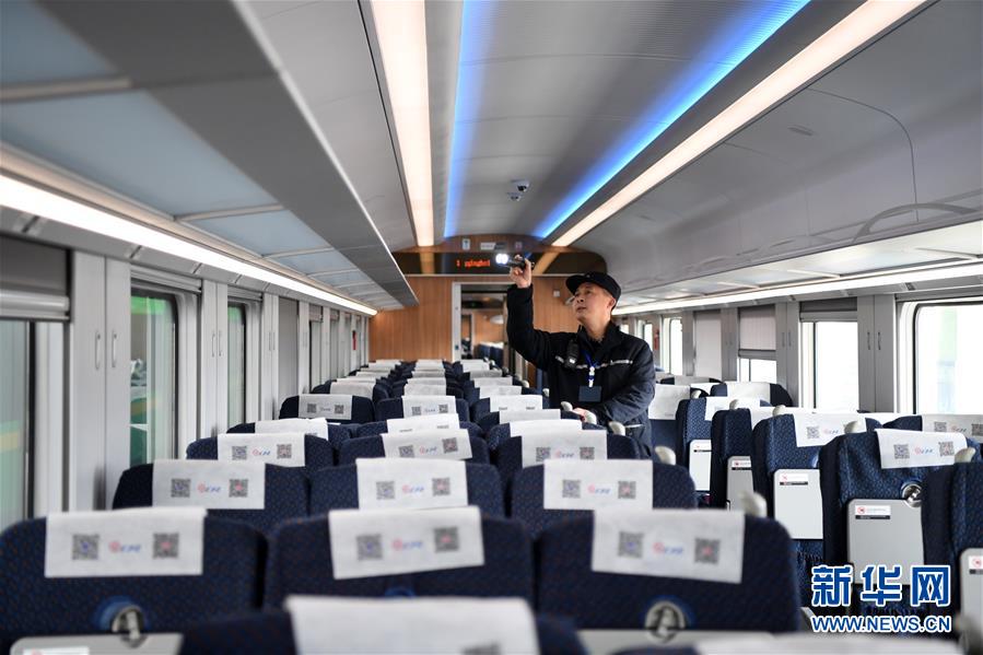 1月7日,铁路员工在对CR200J动车组列车车内设施进行检测维护。新华社记者唐奕摄