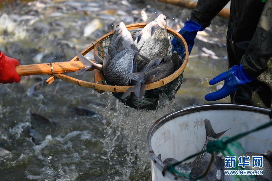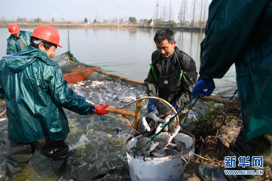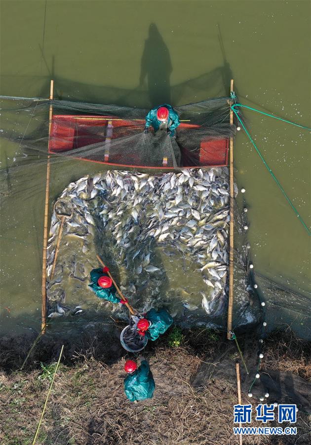 12月28日,渔民们在菱湖镇盛江家庭农场捕鱼。新华社记者黄宗治摄