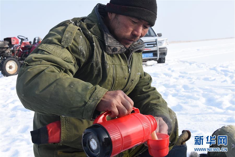 新疆福海县渔民在冬捕间歇喝奶茶(1月5日摄)。新华社记者张晓龙摄