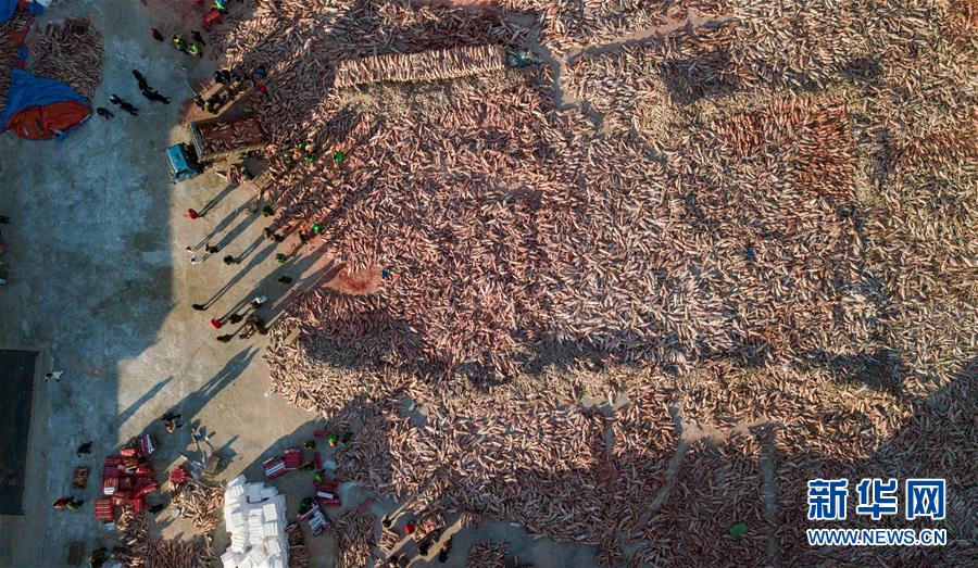 12月27日,在吉林松原查干湖渔场,工人们将鱼装箱(无人机拍摄)。新华社记者张楠摄