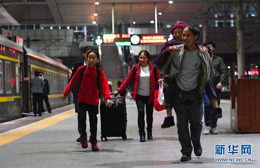 1月10日,在深圳东站,乘坐K4526次列车的乘客秦运林背着76岁的母亲,带着妻子(后中)和女儿(后左一)踏上回家路。当日,2020年春运正式启动。新华社记者毛思倩摄