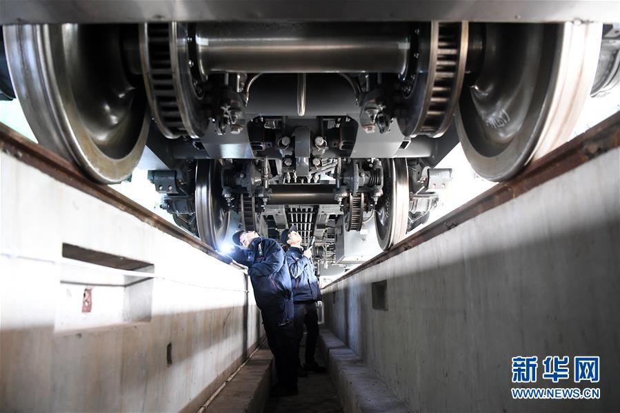 1月7日,铁路员工在对CR200J动车组列车的车轮和车轴进行检测维护。新华社记者唐奕摄