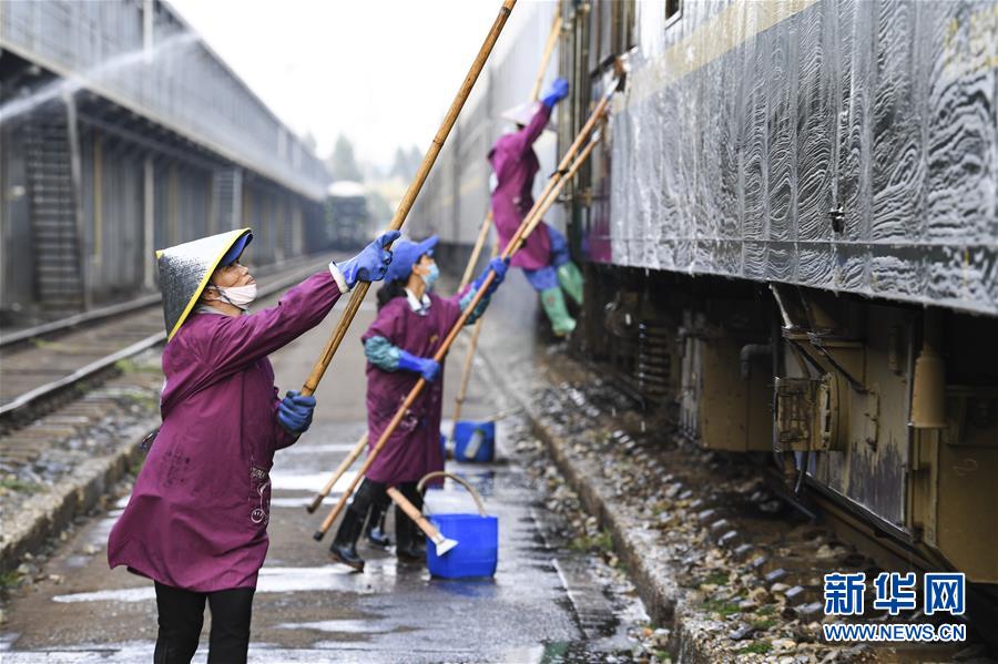 1月8日,清洁人员对列车车体进行清洗。新华社记者曹祎铭摄