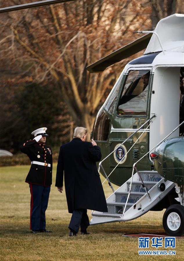 1月9日,在美国华盛顿的白宫南草坪,美国总统特朗普(右)准备登上直升机,前往俄亥俄州参加竞选集会。