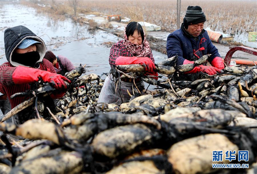 1月10日,村民在磁县禾下土白莲藕立体种养基地收获莲藕。 新华社记者 王晓 摄