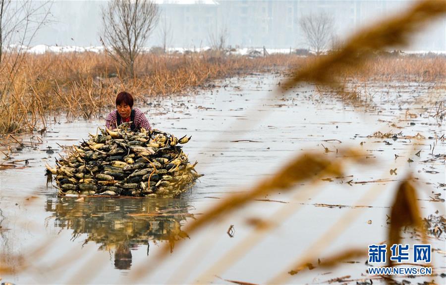 1月10日,村民在磁县禾下土白莲藕立体种养基地采收莲藕。 新华社记者 王晓 摄