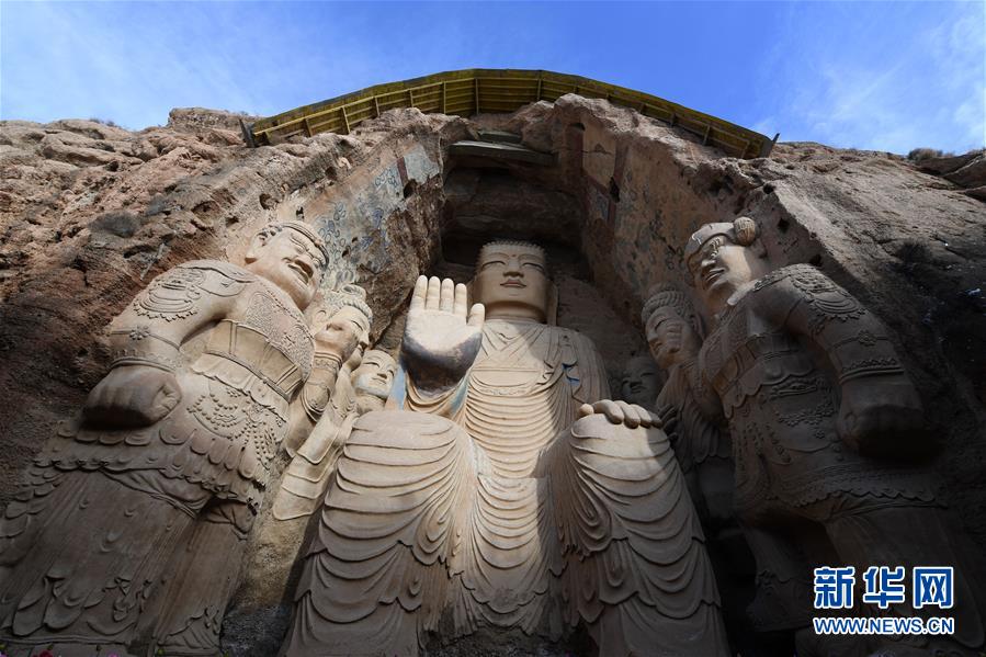 1月11日拍摄的天梯山石窟13号窟。位于甘肃省武威市的天梯山是祁连山东线的一条支脉,开凿于岩壁上的天梯山石窟始建于东晋十六国时期的北凉,距今约有1600年历史,是我国早期石窟艺术的杰出代表。新华社记者马宁摄