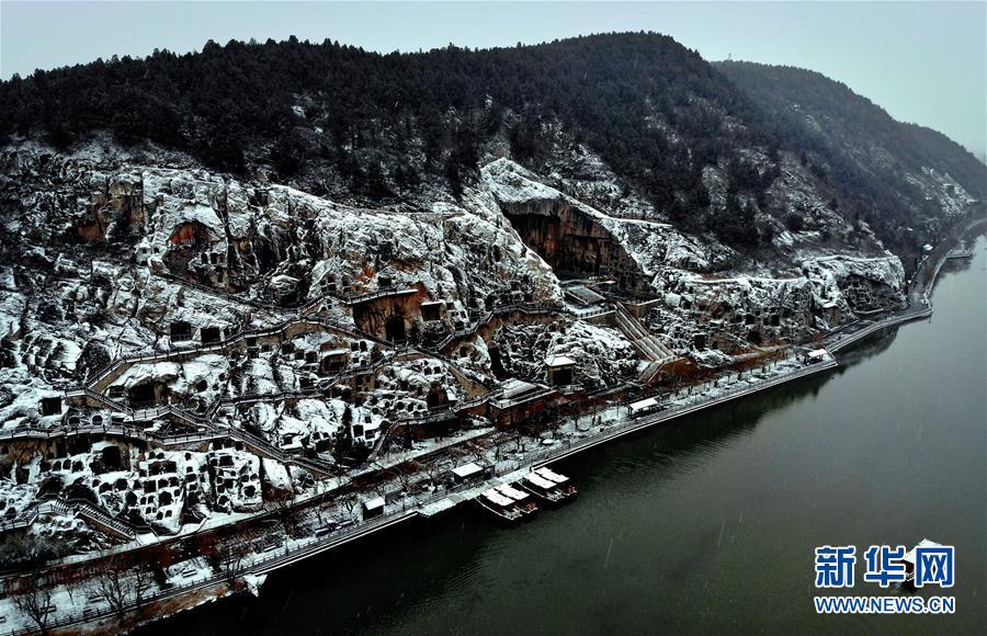 1月9日无人机拍摄的洛阳龙门石窟雪景。新华社记者李安摄