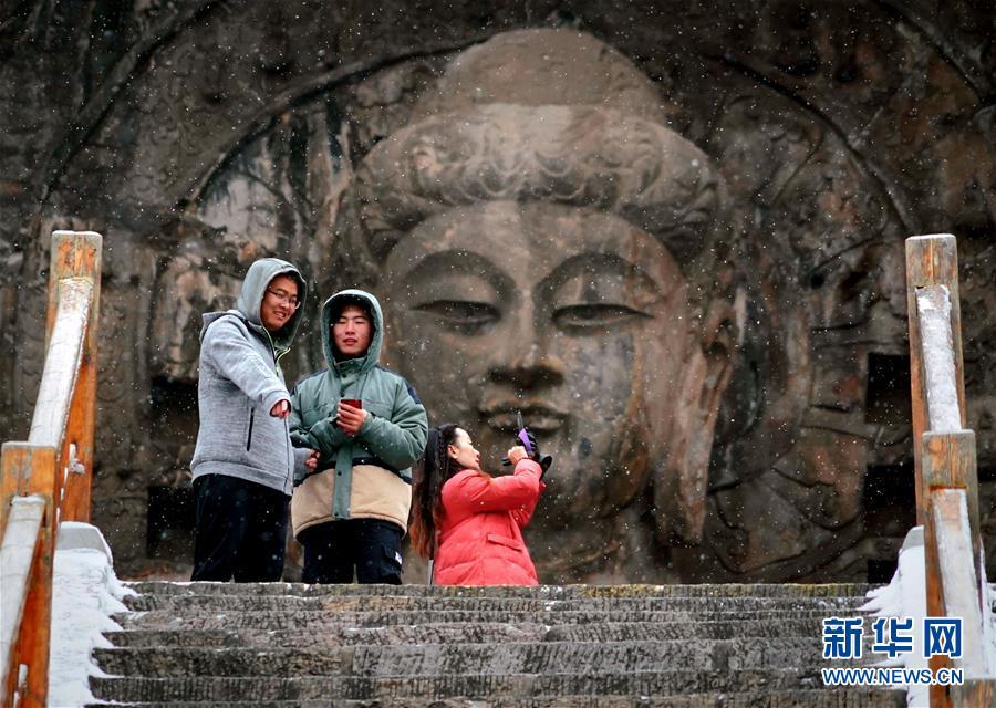 1月9日,游客在洛阳龙门石窟景区内的卢舍那大佛前拍照赏景。新华社记者李安摄
