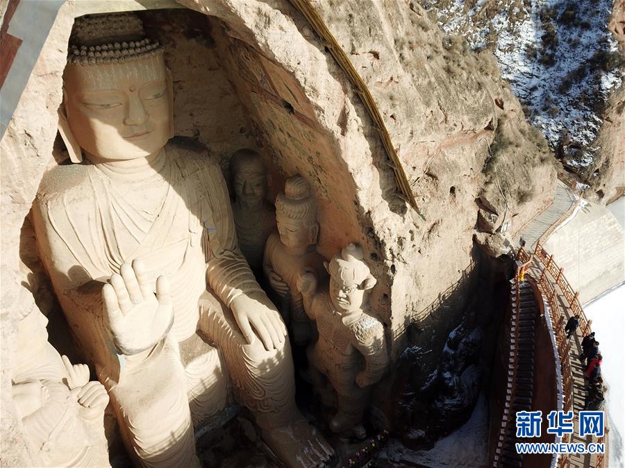 1月11日,游客在参观天梯山石窟13号窟(无人机照片)。新华社记者马宁摄