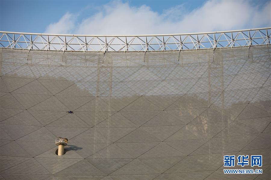 8月28日,工作人员在对FAST进行检修。近日,工作人员对“中国天眼”进行日常维护和检修,给“天眼”进行全面“体检”。被誉为“中国天眼”的500米口径球面射电望远镜(FAST)于2016年9月25日落成启用,即将迎来落成三周年。新华社记者欧东衢摄