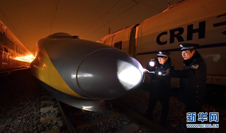1月11日傍晚,北京铁路公安处动车检修基地派出所副所长蒋鹏和民警田永刚开始动车检修基地内的春运安保巡逻和检查工作,他们会一直工作到次日清晨。