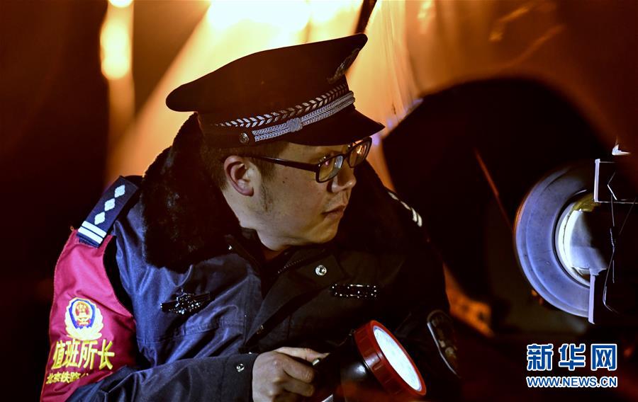 1月12日凌晨,民警田永刚在巡查基地内专用铁道线上停靠的车辆。 新华社记者 李欣 摄