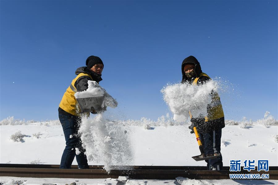 1月13日,白音库伦综合维修车间职工在作业点清理积雪。新华社记者刘磊摄