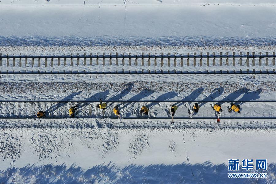 1月13日,白音库伦综合维修车间职工在作业点清理积雪(无人机照片)。新华社记者刘磊摄