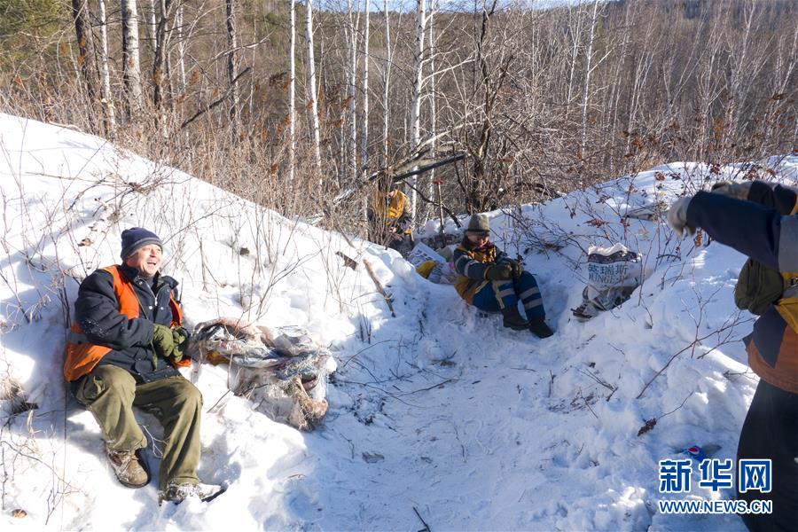 1月8日,西罗奇维修工队工作人员在作业现场坐在雪地上临时休息。新华社记者才扬摄