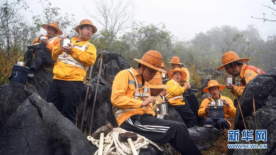 1月14日,百色工务段白水河桥隧工区班组成员在工作间隙吃午饭。在中国铁路南宁局集团公司百色工务段白水河桥隧工区,有一个由14名工人组成的班组。他们常年像“爬山虎”一样行走攀爬在地形险峻、云雾缭绕的高山上,负责南昆铁路辖区路段的搜山扫石工作,清除一切可能危害铁路行车安全的因素,保障旅客出行安全。新华社记者张爱林摄
