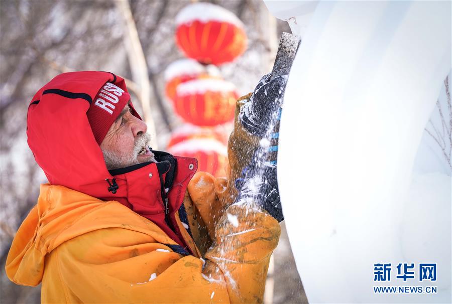 1月13日,参赛选手在哈尔滨太阳岛雪博会园区创作雪雕。新华社记者王松摄