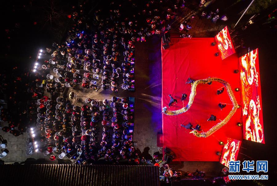 1月14日,杭州市余杭区中泰街道中桥村的文化公园内在进行“我们的村晚”舞龙表演,吸引了大批当地百姓观看(无人机照片)。临近春节,浙江省杭州市余杭区中泰街道各村社的文化礼堂纷纷上演“我们的村晚”。老百姓自编、自导、自演为主的“土味”联欢会因接地气、亲情浓而深受当地百姓的喜爱,成为当地乡村百姓的新年迎春“文化大餐”。近年来,中泰街道以文化振兴助推乡村振兴。目前,中泰街道下属各村陆续建成文化礼堂7个、社区文化家园2个,努力培育和挖掘出一批乡土文化人才及原创作品,2019年全年开展各类乡村社区惠民文体活动累计180余场次。新华社记者徐昱摄
