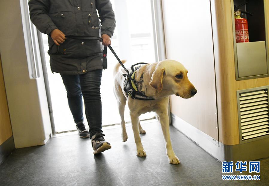 1月12日,导盲犬从宝鸡南站进入列车车厢,进行适应性训练。 新华社记者 李一博 摄