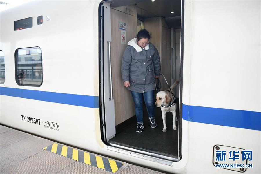 1月12日,训导员带着导盲犬在宝鸡南站下车。 新华社记者 李一博 摄