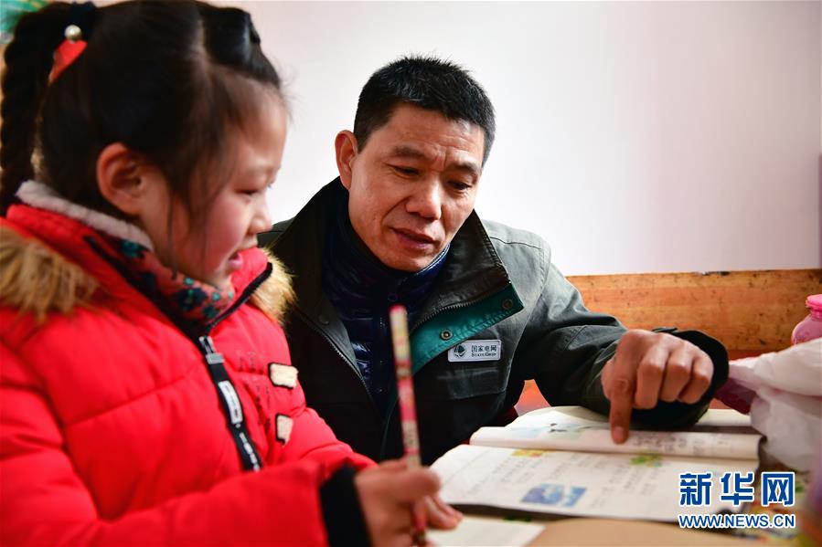 在米村镇拐峪村,郭振伟(右)为贫困户李长安的孙女辅导作业(1月14日摄)。新华社记者 冯大鹏 摄