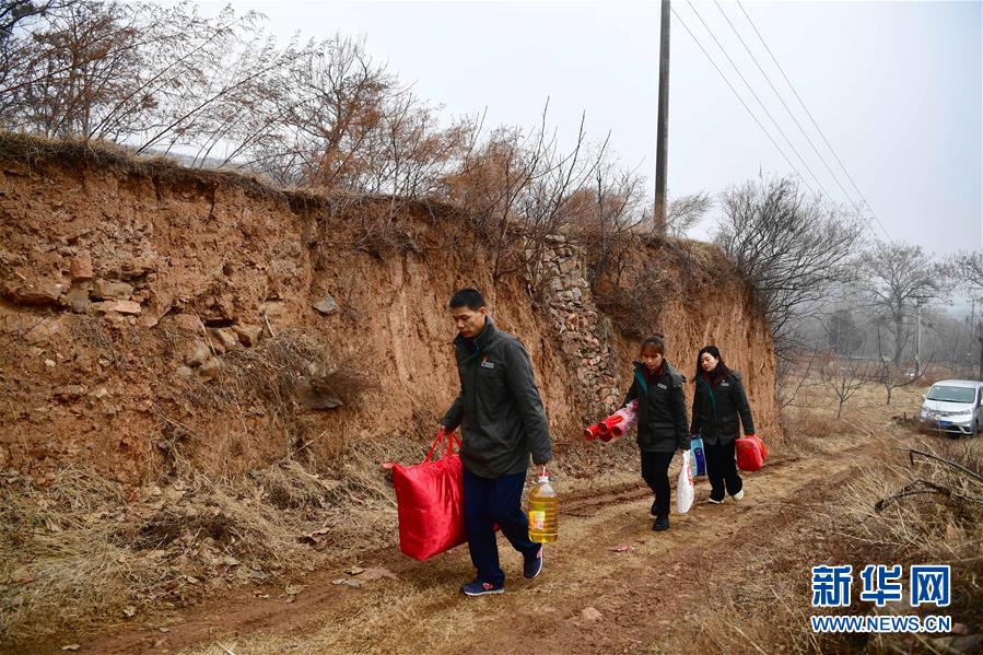 在米村镇拐峪村,郭振伟(前)和同事前往慰问贫困户李长安(1月14日摄)。新华社记者 冯大鹏 摄
