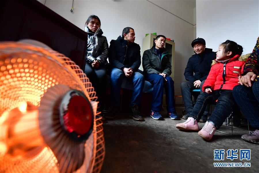 在米村镇拐峪村,郭振伟(左三)和贫困户李长安家人谈心,鼓励他们通过发展产业脱贫致富(1月14日摄)。新华社记者 冯大鹏 摄
