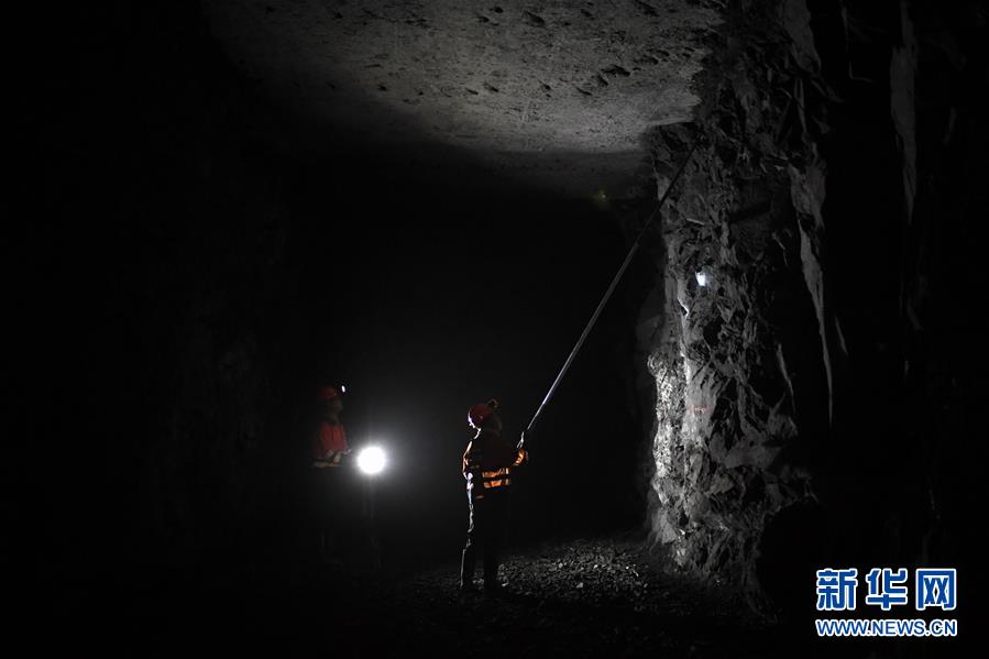 1月14日,在金川集团三矿区采矿工区,工人史万宝(右)和刘文三进行进路检撬作业。 春节临近,位于甘肃河西走廊的中国“镍都”金昌市寒意逼人,但在金川集团股份有限公司地面以下600多米的三矿区各生产工区依旧一派热火朝天的工作场景。这里全年24小时生产,工人们坚守各自岗位,确保井下作业安全有序。 新华社记者 马宁 摄