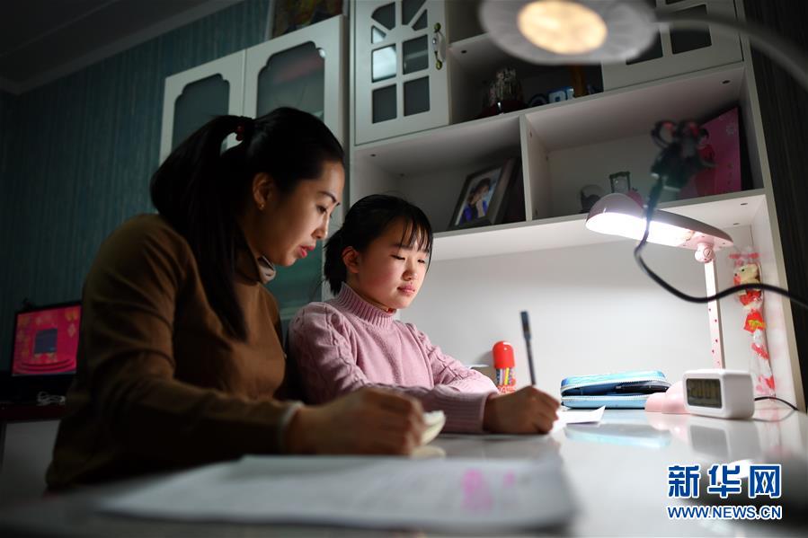 1月14日,陈海燕(左)在家里辅导女儿赵纯艺完成作业。新华社记者 詹彦 摄