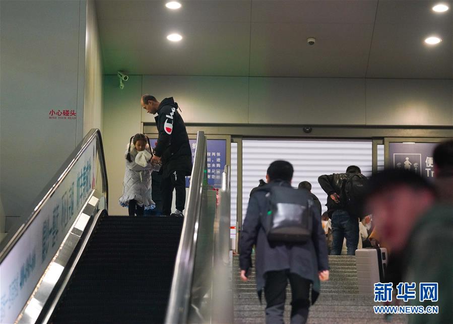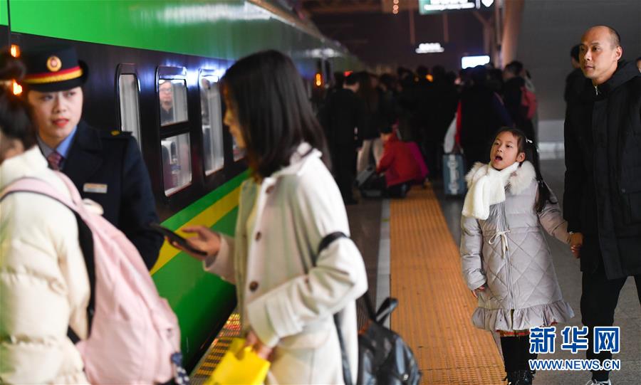 1月3日,卞菁值乘的动车到站,朱梓芮(前右)和父亲寻找卞菁的身影。新华社记者 胡晨欢 摄