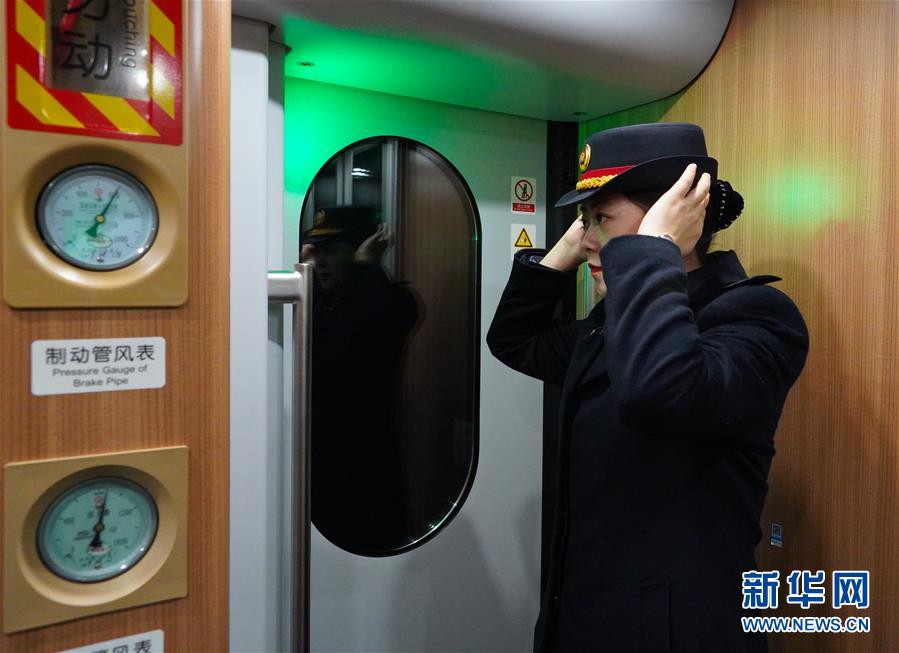拼版照片上图:在运城北站,列车长陈海燕确认旅客上车后通过对讲机通知司机关闭车门(新华社记者詹彦1月11日摄);下图:在太原站,列车长赵耀在列车出发前检查巡视(新华社记者杨晨光1月11日摄)。新华社发