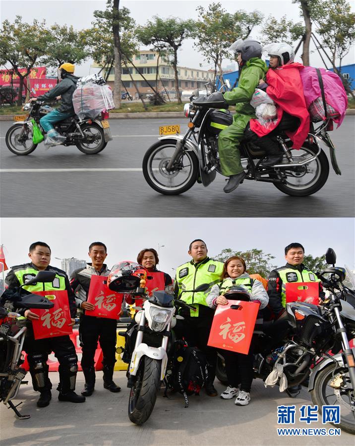 拼版照片:上图是江西、安徽和湖北籍农民工组成的返乡“铁骑大军”骑行在返乡路上(2014年1月23日摄);下图是“90后”外来务工返乡青年冉晓红(左三)和骑友们在中石油漳州龙江路加油站合影留念(1月15日摄)。20岁的冉晓红是重庆人,在福建厦门从事餐饮业,2019年买了一辆高档摩托车,2020年与朋友结伴骑摩托车返乡,路上预计需要五天时间。 新华社记者 魏培全 摄