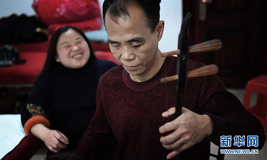 在位于浙江省衢州市的按摩店里,鲁瑞生(右)用二胡拉起《十五的月亮》,妻子余小兰在一旁倾听(1月7日摄)。