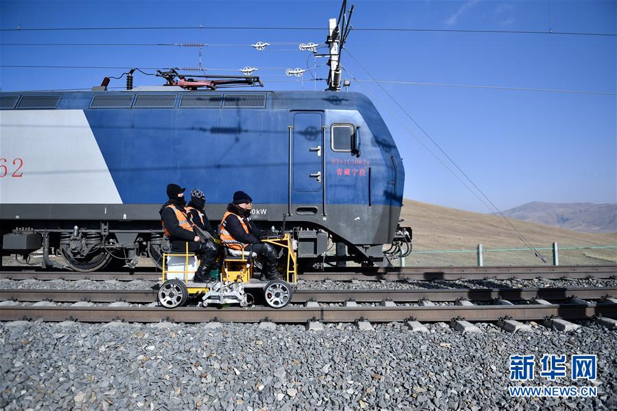 1月16日,青藏铁路公司西宁工务段探伤车间工人操作双轨式钢轨超声波探伤仪在青藏铁路海晏至青海湖区间进行检测。新华社记者 张龙 摄